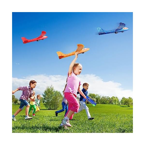 Toy Set Contents: Foam glider X 3, catapult gun plane X 1, dinosaur-shaped sticker X 3. Glider toy comes with 3 different colors of gliding foam airplane, blue, orange and red. LED lights increase fun and visibility at night.