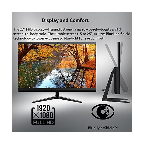 DISPLAY AND COMFORT: The 27” FHD display—framed between a narrow bezel—boasts a 91% screen-to-body ratio. The tiltable screen (-5 to 25°) utilizes BlueLightShield technology to lower exposure to blue light for eye comfort.