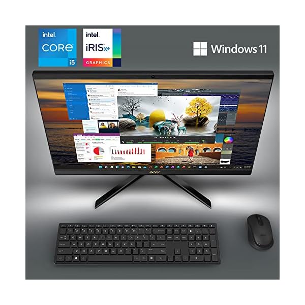 Acer Aspire C27-1700-UA91 All-in-One Desktop PC comes with these specs: 12th Generation Intel Core i5-1235U 10-Core Processor, Up to 4.4GHz Max Turbo Frequency, Supporting hybrid core architecture with Performance-core and Efficient-core (12MB Smart Cache), Windows 11 Home, 27″ Full HD Widescreen Edge-to-Edge LED Back-lit IPS Display, Intel Iris Xe Graphics, 16GB DDR4 Memory, 512GB NVMe M.2 SSD, Integrated 5.0 MP HD Webcam with 2 Stereo Microphones and Webcam Cover, Intel Wireless Wi-Fi 6 AX201 802.11ax Dual-Band 2.4GHz and 5GHz featuring 2×2 MU-MIMO technology, 10/100/1000 Gigabit Ethernet, Bluetooth 5.2, Two Built-in Stereo Speakers, 1 – USB 3.2 Type C Gen 2 port (up to 10 Gbps) (Rear), 2 – USB 3.2 (Type A) Gen 1 ports (Rear), 1 – USB 3.2 (Type A) Gen 2 port (Rear), 1 – HDMI-out Port (Rear), 1 – Ethernet RJ-45 Port, Wireless Keyboard and Mouse, 19.18 lbs. | 8.7 kg (system unit only), 1 Year Parts and Labor Limited Warranty with Toll Free Tech Support (DQ.BK3AA.001).