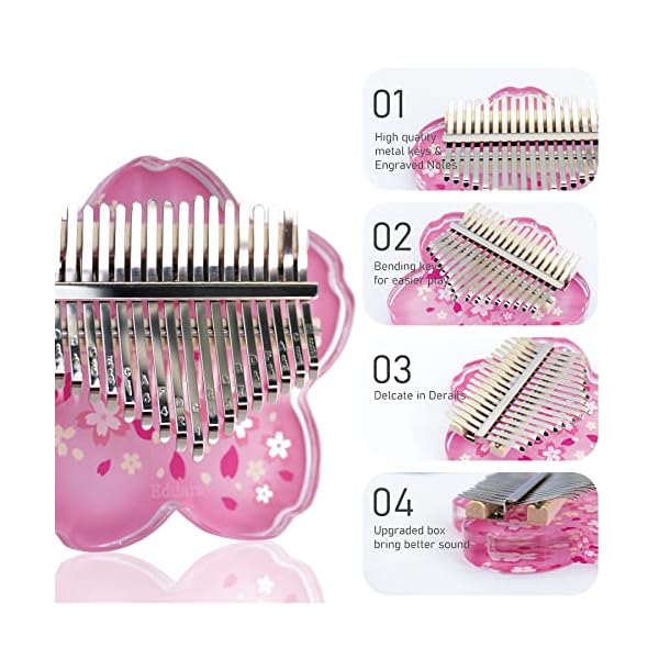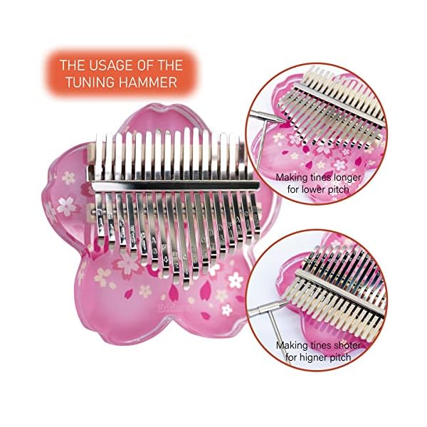 Premium Material: This Kalimba thumb piano is made of high grade acrylic and 17 ore steel keys. Colorful design, fade resistant, unique cherry blossom appearance design, fresh and delicate appearance, excellent texture, easy to clean.