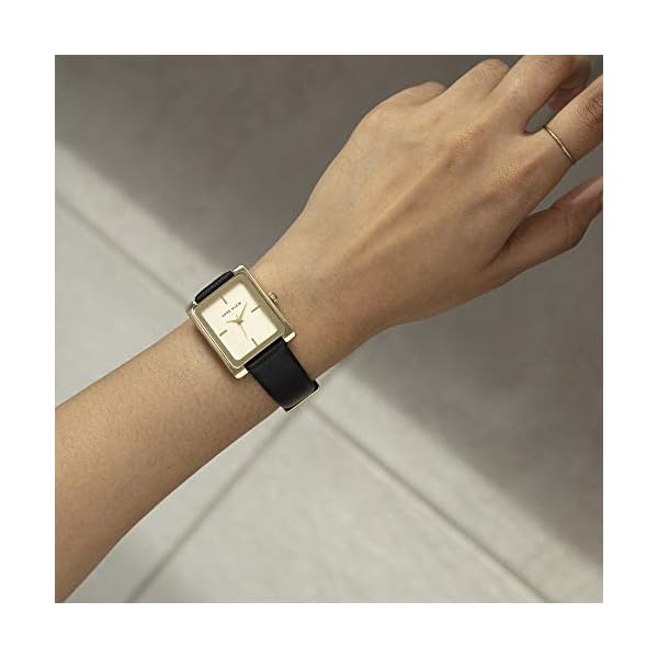 Curved mineral crystal lens; light champagne dial with gold-tone hands and markers