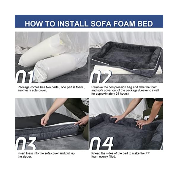 🐶Easy Clean & Care: Durable & Sturdy 2-Sided Zipper Design that you can use to get the foam out easily, Machine wash the outer cover separately (Note: Do Not Wash Foam). Since our dog bed is vacuum packed for shipping. Please after foam and dog bed cover take out of the package leave to restore the fluffy shape for approximately 24~48 hours.