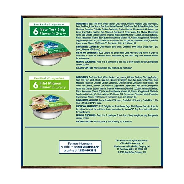 Contains one (1) variety pack of BLUE Delights Natural Adult Small Breed Wet Dog Food Cups, Filet Mignon Flavor in Hearty Gravy and New York Strip Flavor in Hearty Gravy 3.5-oz (12 pack- 6 of each flavor)