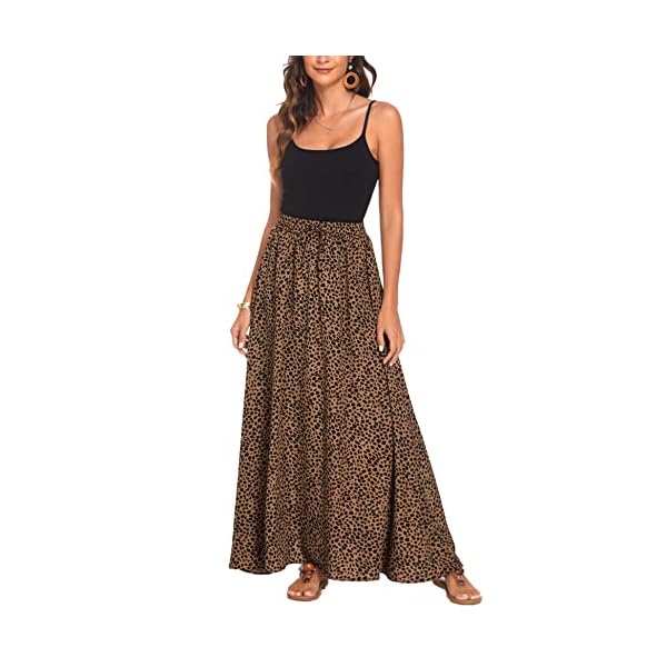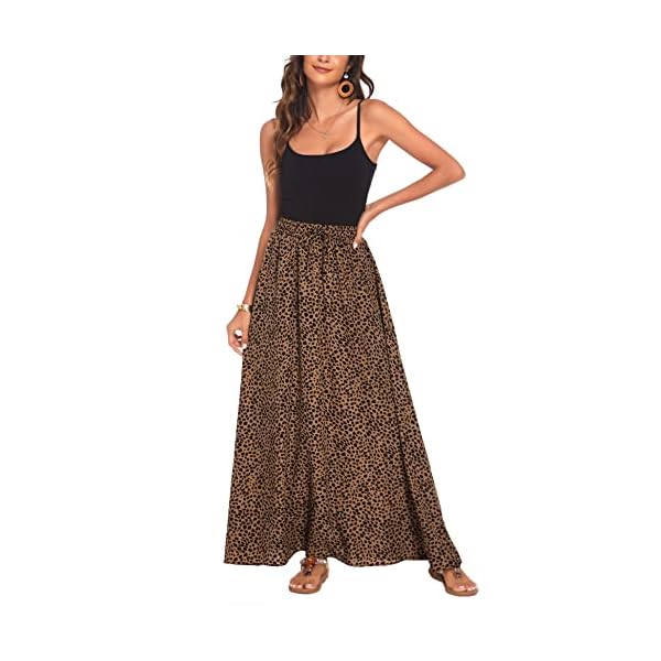 Fashion Design: Leopard print casual A-line maxi skirts with pleated elastic high waisted design, soft material, floor length, simlpe basic style, easy to dress up and down.