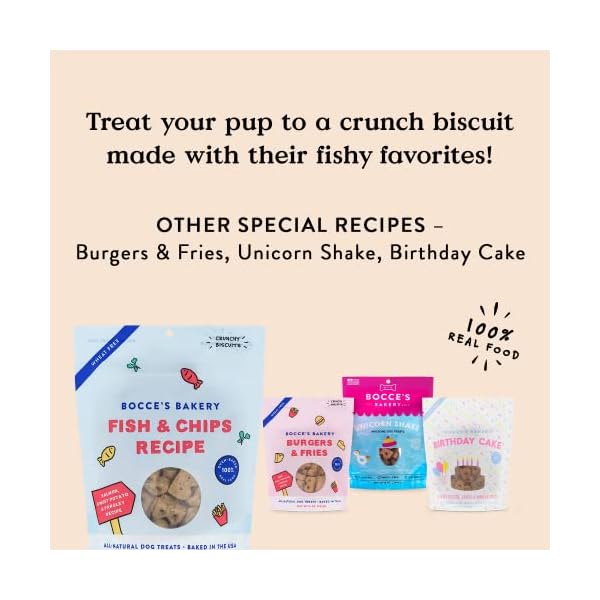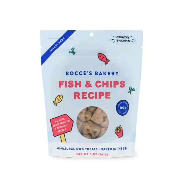 Shop - Bocce’s Bakery Fish & Chips Treats for Dogs – Special Edition Wheat-Free Dog Treats, Made with Real Ingredients, Baked in The USA, All-Natural Salmon & Sweet Potato Biscuits, 5 oz