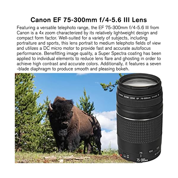Canon EF-S 18-55mm f/3.5-5.6 IS II Lens is a sleek and flexible option for everyday shooting. Spanning a 28.8-88mm equivalent focal length range, this lens covers wide-angle to portrait-length perspectives + Canon EF 75-300mm f/4-5.6 III Lens