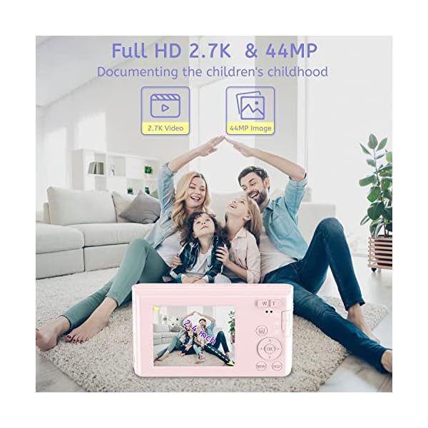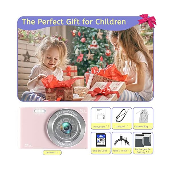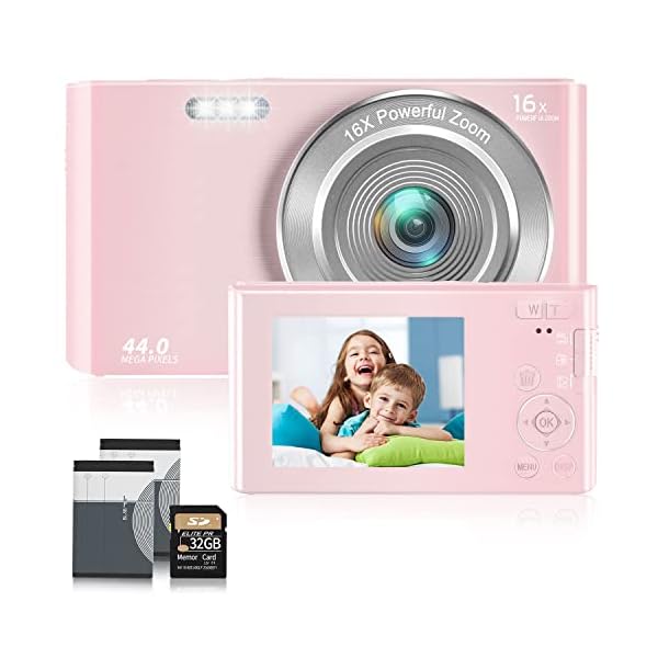 Digital Camera,Kids Camera with 32GB Card 4K 44MP Point and Shoot Camera with 16X Digital Zoom 2.4 Inch,Vlogging Camera for Students Teens Adults Girls Boys-Pink3