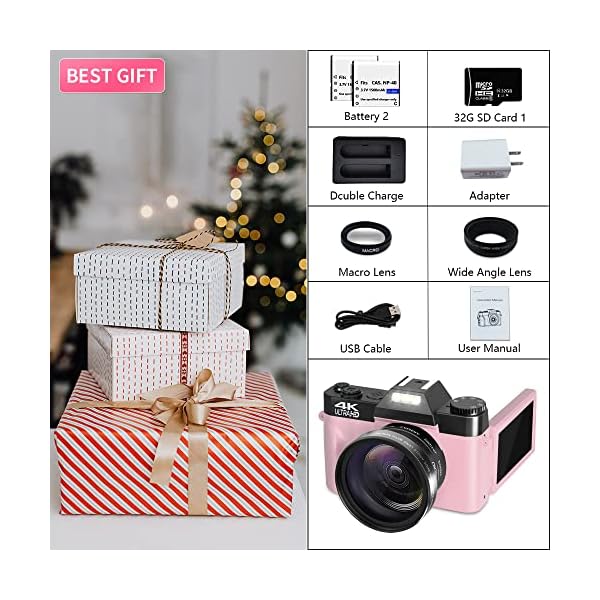 Digital Cameras for Photography, 4K 48MP Vlogging Camera 16X Digital Zoom Manual Focus Rechargeable Students Compact Camera with 52mm Wide-Angle & Macro Lens, 32G TF Card and 2 Batteries
