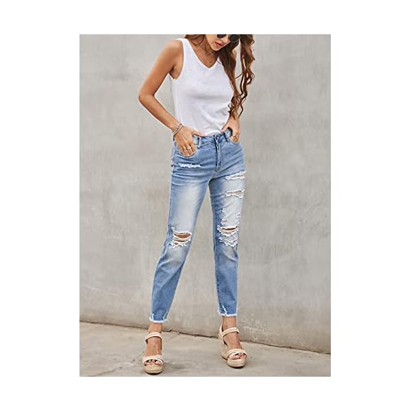 Feature: ripped jeans, mide rise pants, easy zipper fly with a button closure, classic five-pocket design, denim jeans for women, ankle length, distressed jeans.