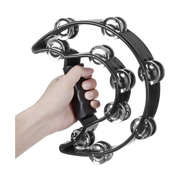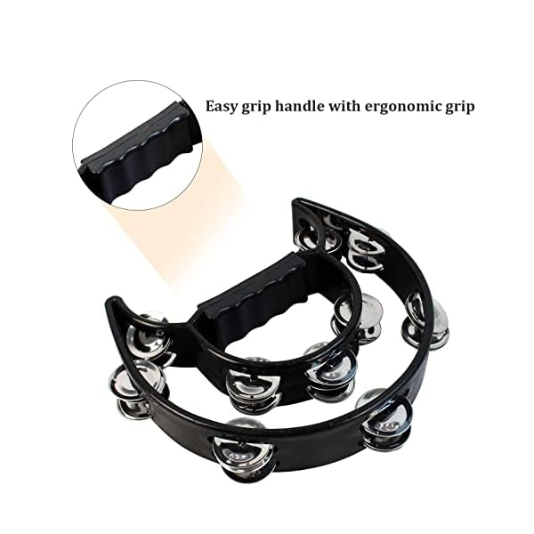 Unique Design- This tambourine adopts a semi-circular arc appearance and a concave-convex handle design, which is non-slip and wear-resistant, stable and firm, the tambourine is not easy to slip by hands. The edge of the bell is curled, which does not hurt your hands, you can use this tambourine with confidence