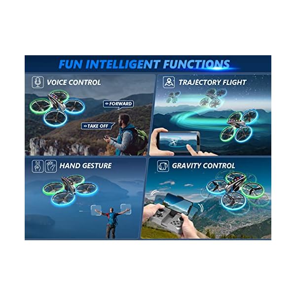 【Stunt Drone with Multiple Playing Ways】Features with stunt functions like 3D Flips,Circle Fly,Auto Rotation,Trajectory Flight, Voice Control,Gravity Control. Open up the Gravity-Sensor Mode, you can control the direction of the drone by simply tilting the drone in different directions.