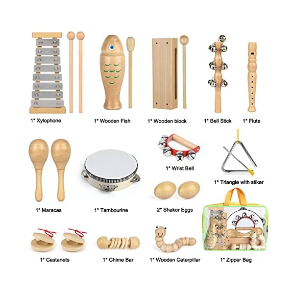 ♫【Easy to Carry & Storage】All Kids can have fun with our 23 pieces wooden musical instruments in this set. At the same time you can take part of instrument set out in your bag ,toddler’s package, as most instruments of our musical toy set is easy to carry, and they can also let your kids keep busy for much hours.