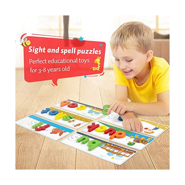 80Pcs of See & Spell Learning Toys:This set develops sight-reading vocabulary, spelling, and fine motor skills, color sorting, letter recognition, word association, building sights words, and matching; it’s an easy and exciting toy that multiple children can play with at once, helping them develop important social skills. Contains 28 double sided flash cards + 52 wooden blocks.