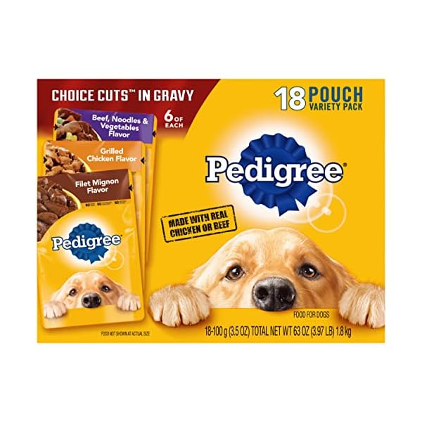 Contains eighteen (18) 3.5 oz. pouches in PEDIGREE CHOICE CUTS in Gravy Adult Wet Dog Food Variety Pack: (6) Beef, Noodle & Vegetables Flavor in Sauce (6) Grilled Chicken Flavor in Sauce, (6) Filet Mignon Flavor in Gravy
