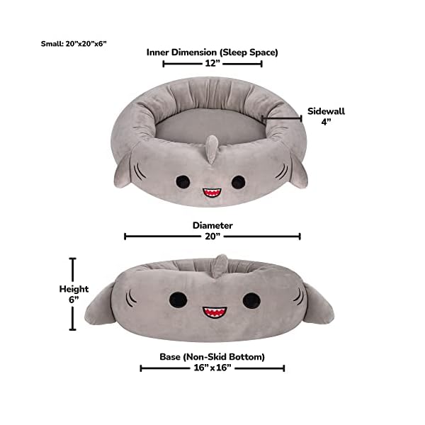 This super-soft round Squishmallows Gordon shark bolster pet bed is perfect for cuddly cats and dogs alike. Cushioned bolsters around the edges create a natural headrest and include cute Squishmallows design details. The comfy sleeping area is stuffed with fluffy polyester-fiber filling and a unique squishy fabrication covering the outside. Each pet bed features a cute and colorful Squishmallows style that brings a playful spin to traditional pet beds. Authentic Squishmallows pet beds are easy to maintain, spot clean only. These loveable and snuggable Squishmallows pet beds are the softest and cutest pet beds around. Join the Squad!