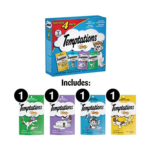 Contains four (4) 3 ounce pouches of Temptations Classic Cat Treats Variety Pack: (1) Seafood Medley Flavor, (1) Tasty Chicken Flavor, (1) Creamy Dairy Flavor, (1) Tempting Tuna Flavor