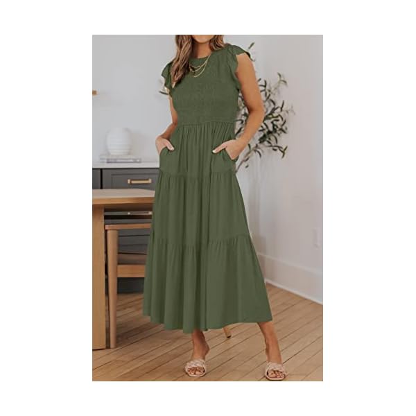 ZESICA Women’s 2023 Summer Casual Flutter Short Sleeve Crew Neck Smocked Elastic Waist Tiered Midi Dress